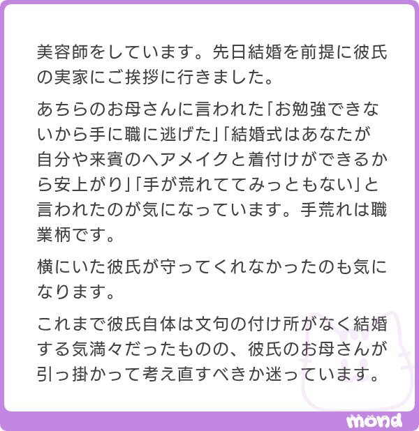 結婚式なんて一番に花嫁さんが大事にされる特別な日なのに、安上がりをアテにされ、国家資格持ってるって経済的にも強い事なのに馬鹿にして、着付けやメイクも花嫁にさせるような甲斐性無しな家のくせ、手が綺麗じゃないとかお手伝いさんがいるような家の奥様じゃなきゃ綺麗な手は無理がある 毒義母よ x.com/apricot_candy_…