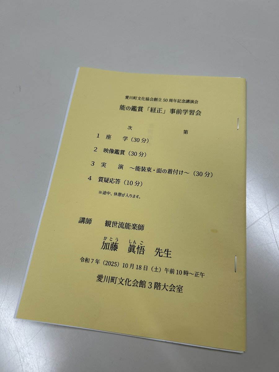 #能 #経正 #能楽 愛川町文化協会創立50周年記念事業 能の鑑賞「経正」事前学習会(愛川町文化会館3階大会議室)) 観世流能楽師・加藤眞悟さんを講師にお迎えし、10/25(土)の本公演の事前学習会を行い、能や「経正」の理解を深めました。 能装束の着付け体験も行いました! #愛川町 pic.x.com/21Nu1NArYS x.com/spobun_ka/stat…